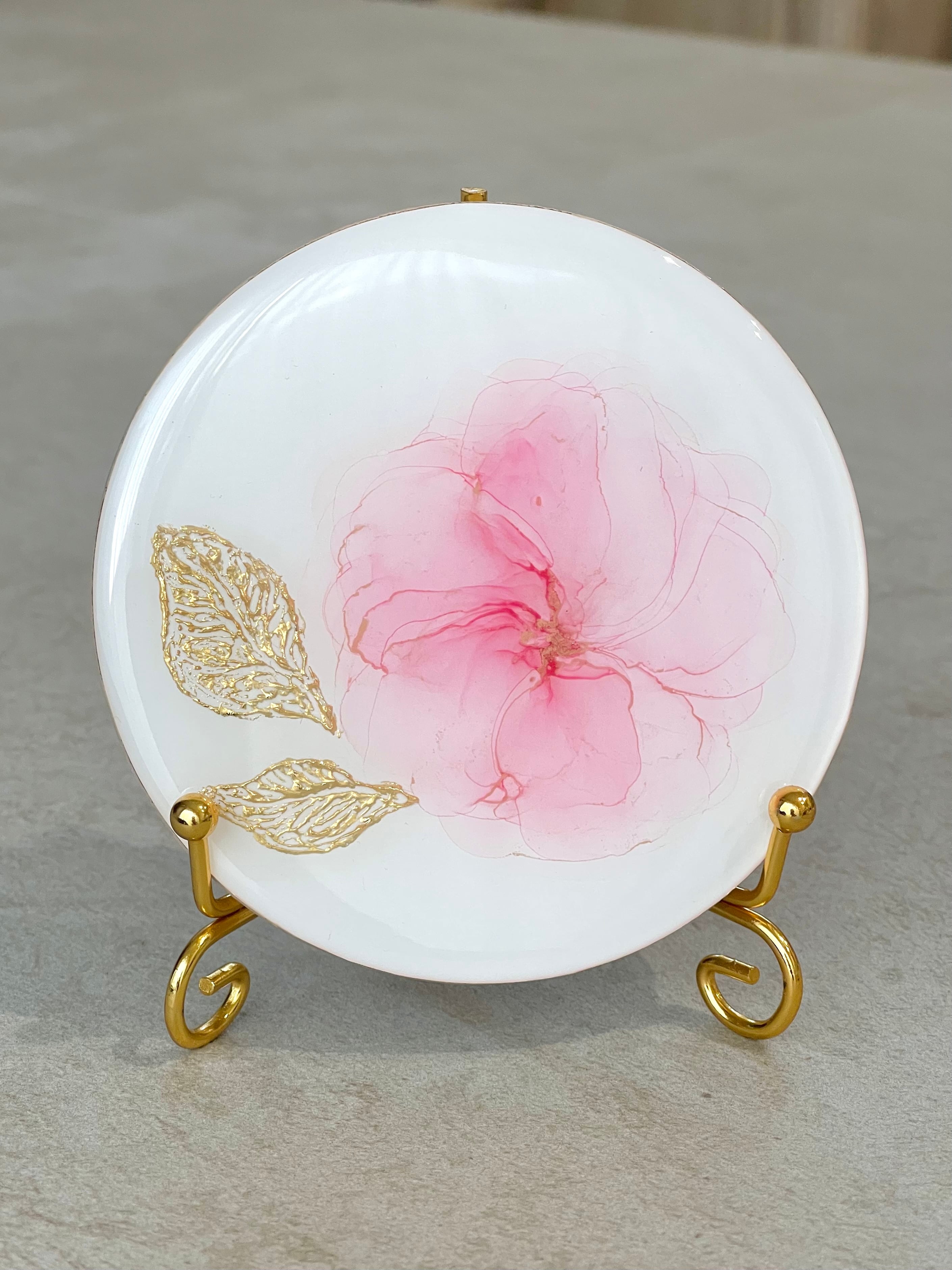 【作品情報】 size / φ10cm × 約7mm (ゴールドアイアンイーゼル付) material / アルコールインク、エポキシレジン @art_resin 、MDFパネル ★ Instagramで作品を動画で確認できます。ぜひ合わせてご覧下さい。 ・・・ ▼ 下記を必ずお読みください アルコールインクアートとは、アルコールインクを紙などに垂らし、にじみ合うインクをアルコール液と風で動かし、偶然出逢う色味やデザインを楽しむことの出来る一期一会のアートです。 ですので、作品は全て一点物となります。 インクの性質上、経年と共に褪色を免れないものとされておりますが、UVカットのための保護スプレーを何度も施し 褪色しにくい加工をさせていただいております。 レジンコーティング時には、業界最高峰と言われているアートレジン社のレジン液を使用しております。 美術館や博物館で長く使われている最高級クラスのレジン液ですので、大変透明度が高く、黄ばみの少ないものとなります。 ですが、それでも紫外線には強くはないため、なるべく直射日光を避けて日の当たらない場所で使用していただけますと、アートを長く楽しんでいただくことができます。 また、作品は全て一般家庭にて手作業で行っております。 細心の注意を払って制作しておりますが、微細なホコリや気泡などが混入していることもございます。 ハンドメイドとしてのあたたかみを感じていただけましたら幸いです。 ※ 作品は、画鋲や釘に引っ掛けて壁に飾ることができます。 ※ 商品写真は実際のお色味に近づけて撮影、編集しておりますが、お使いのモニターや環境により誤差が生まれることがございます。ご了承くださいませ。 ※ 制作時に多少の傷等が生まれる場合がございます。使用時への影響はございませんが、予めご了承いただき、気にならない方のみご購入くださいませ。